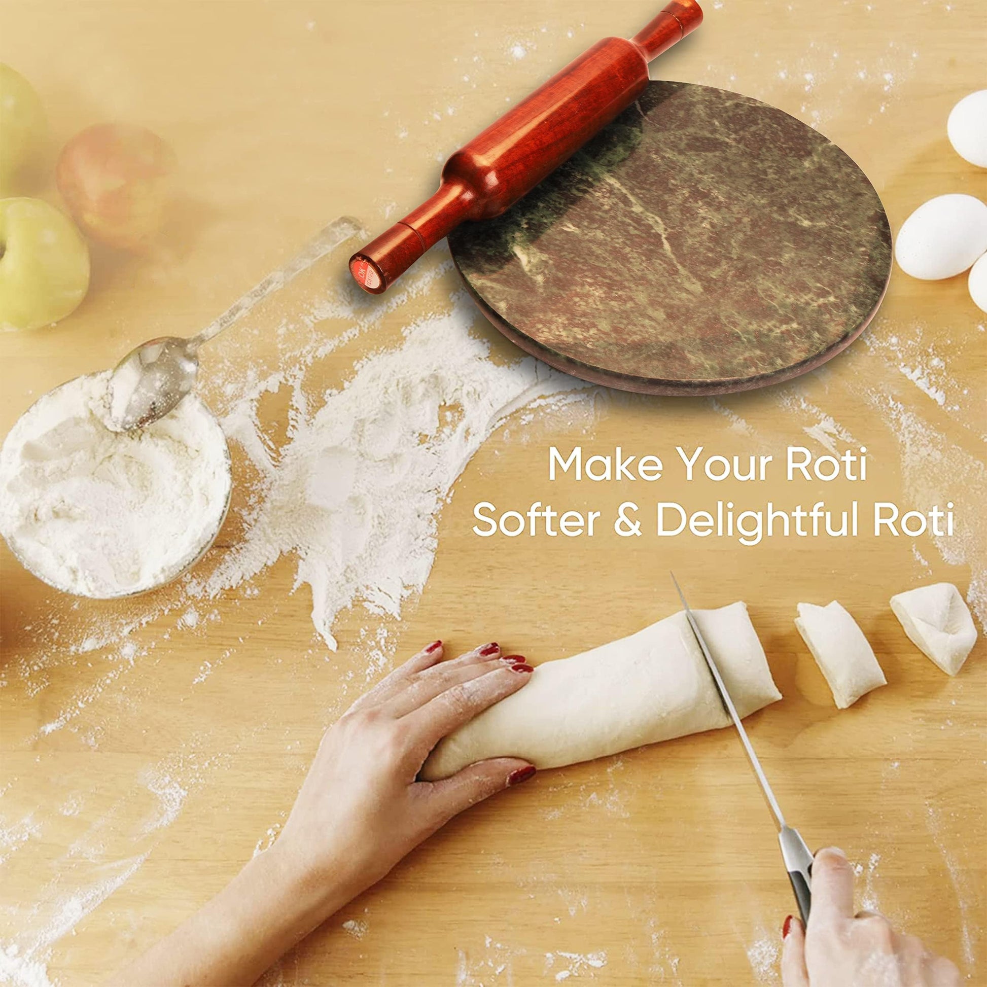 - Elevate your Indian cooking with this premium 9-inch marble chakla, meticulously handcrafted from authentic green stone. Designed for rolling chapati, puri, and dough with precision, this heavy-weight board features a naturally non-slip surface that ensures stability during use. The cool marble surface prevents dough from sticking, making every rotation effortless and consistent. Its substantial construction provides durability for daily kitchen use, while the elegant green stone aesthetic adds a touch of sophistication to your culinary workspace. Perfect for home cooks and professionals seeking reliable, traditional cookware that combines functionality with timeless appeal.